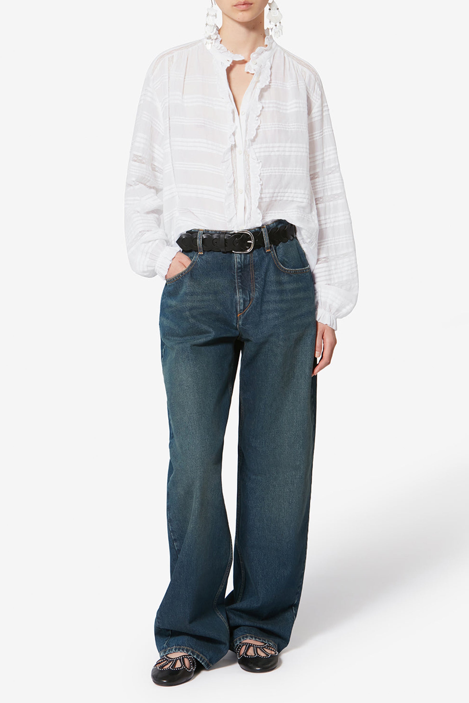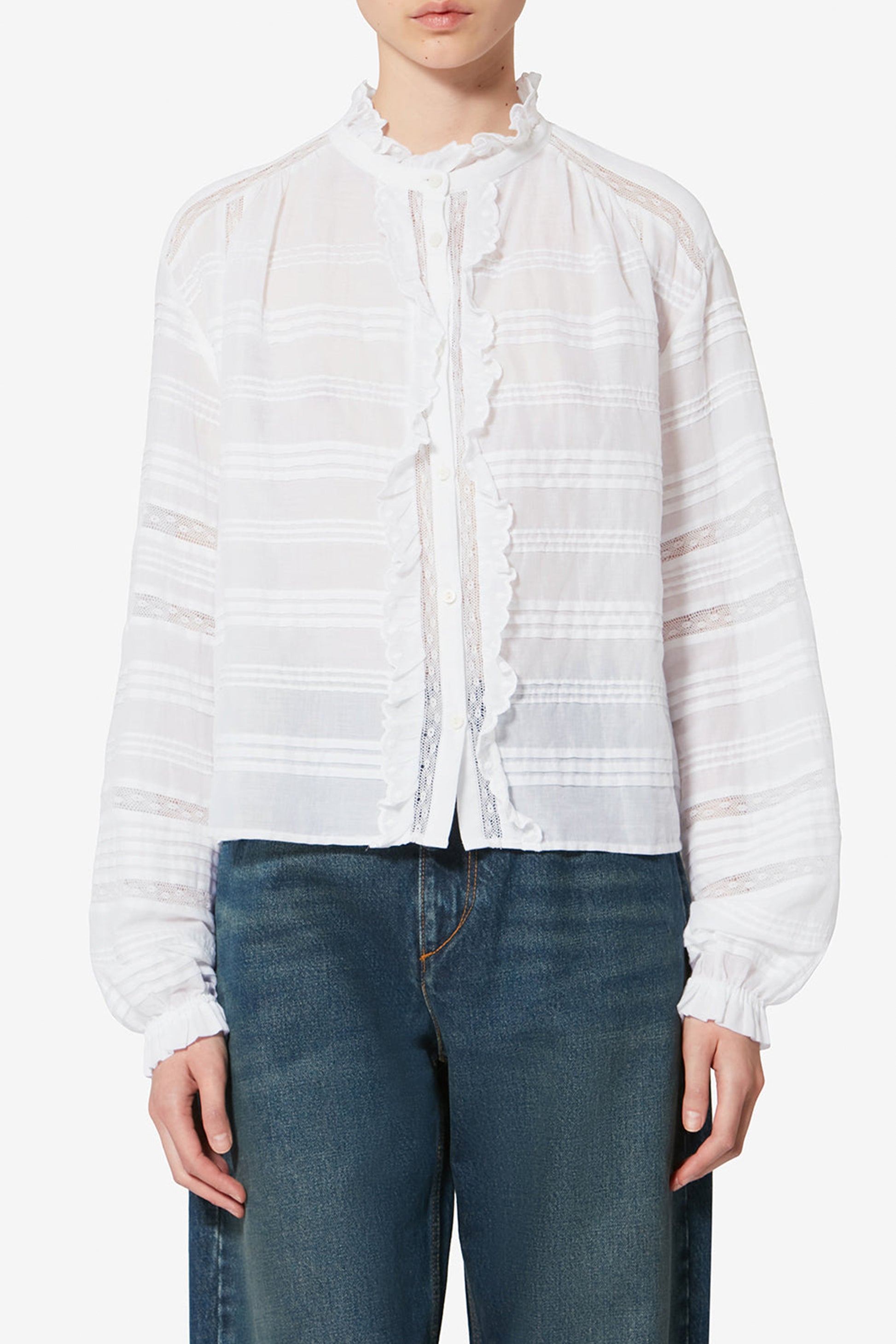 - Volants am Kragen und entlang der Knopfleiste